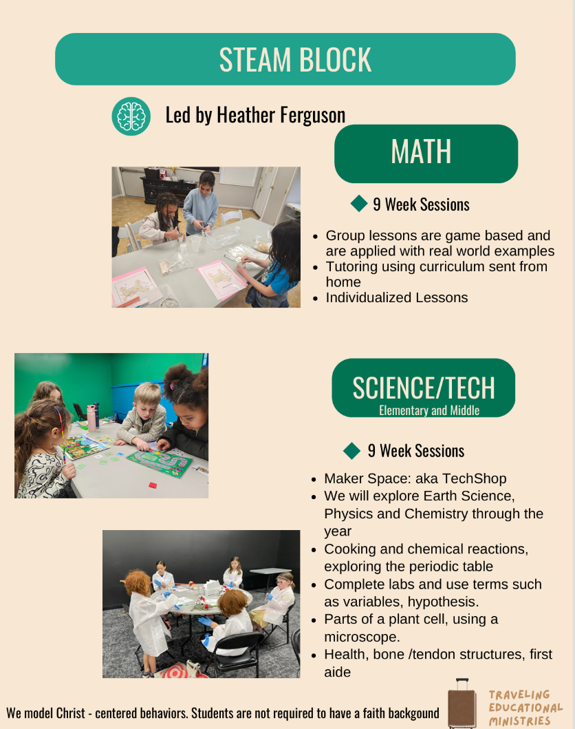 Students will work in small groups (6-12 students per class at most) to build strong skills in core subjects of reading, writing, math, and science. We strongly encourage families to register for both Monday and Wednesday, so that consistency is established. Teachers are highly trained, with lead teachers both holding a master's degree. Support staff have significant experience working with children in different capacities.