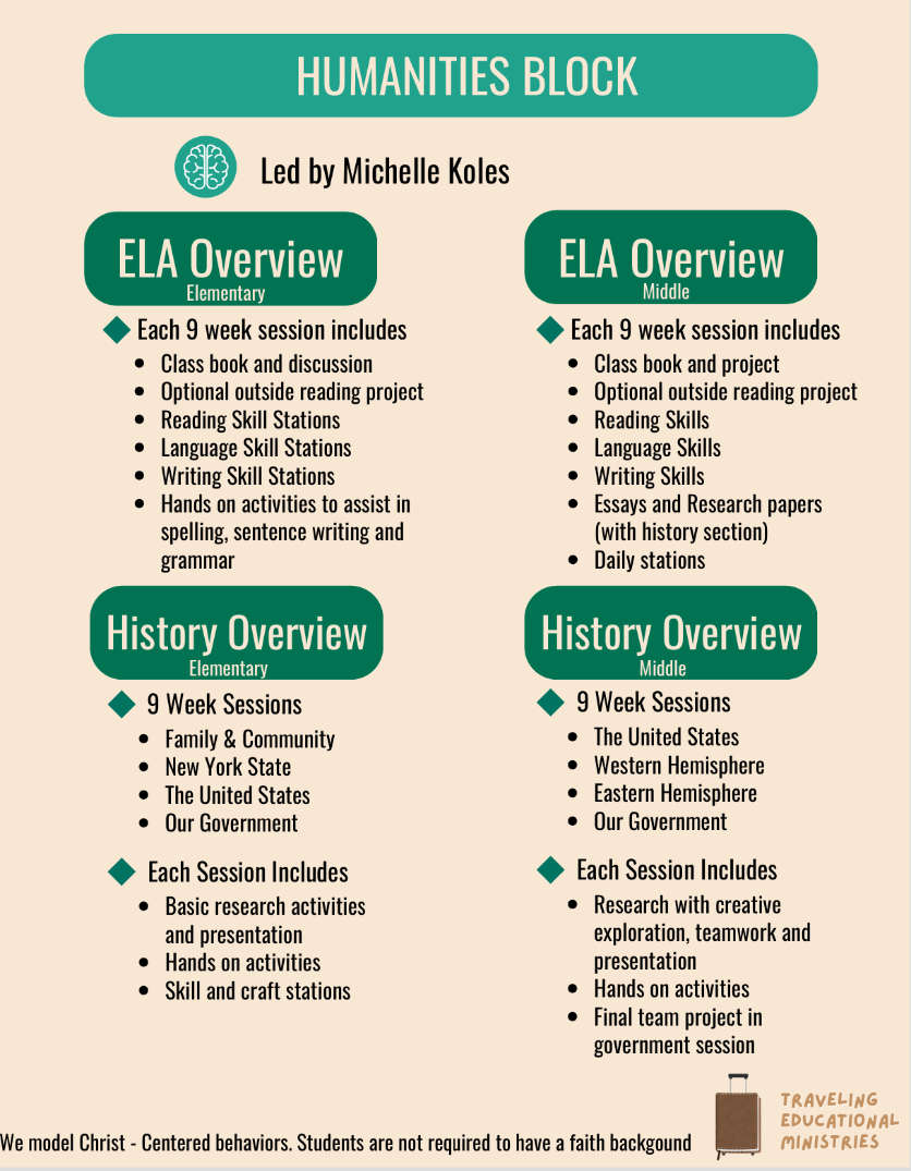 Ages 8-14 start in Humanities from 9-11:30 and move into lunch and PE. During the afternoon they attend STEAM classes from 12:30-3